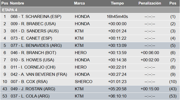 Juan Santiago Rostan (KTM) y Leonardo Cola (KTM) siguen a buen ritmo y no dejan de ganar posiciones, lo que no es poco desde lo moral, ya que certifican que están actuando muy bien. Rostan es 43º (32º en Rally2) en la general y Cola 53º (42º en Rally2). En esta clasificación, el líder ahora es el norteamericano Preston Campbell (Honda).
