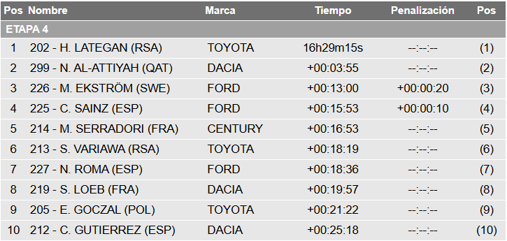 Pasando al mundo de los autos, en Ultimate hubo otro nuevo cambio importante: Mitch Guthrie (Ford) se cayó en la clasificación general, rotundamente, y Toyota volvió al protagonismo de la mano del sudafricano Henk Lategan, quien fue apabullante junto a Brett Cummings en la navegación. Derrotaron a un inspirado Nasser Al Attiyah (Dacia), y ahora entre la Hilux GR y el Sandrider, está la pelea por la general. Menos de cuatro minutos los separan, y Ford ahora tiene el tercer y cuarto lugar con Mattias Ekström y Carlos Sainz, cuyas Raptor están a 13 y casi 16 minutos respectivamente. El quinto es Mathieu Serradori (Century).