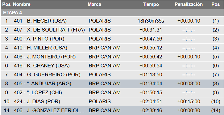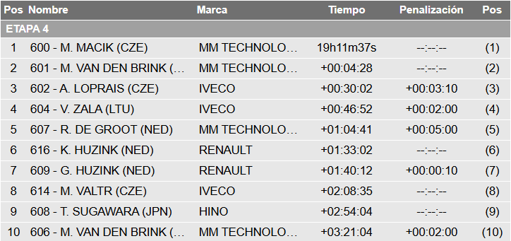 Completando, los Camiones cambiaron de líder, porque Martin Macik (Iveco) ganó la especial y superó a Mitchel Van den Brink (Iveco) en una lucha que se tornó entre ambos por la general, mientras que el tercero, Ales Loprais (Iveco), está a media hora.
