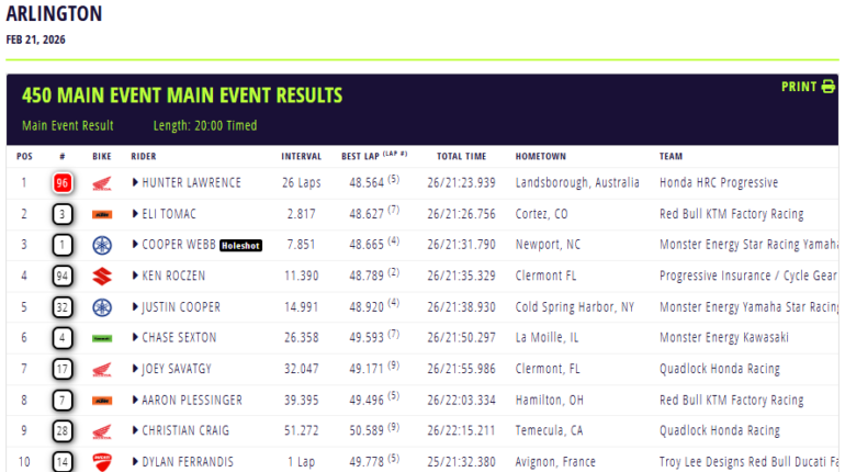 Con aire limpio al frente, Lawrence administró su ventaja y resistió el último intento de Tomac para sellar su primera victoria en la categoría reina por 2.8 segundos. Webb completó el podio y Roczen fue cuarto. El australiano se convirtió en el quinto ganador distinto del año y tomó el liderazgo del campeonato con cuatro puntos sobre Tomac, mientras Webb y Roczen se mantienen a 16 y 18 unidades, respectivamente.