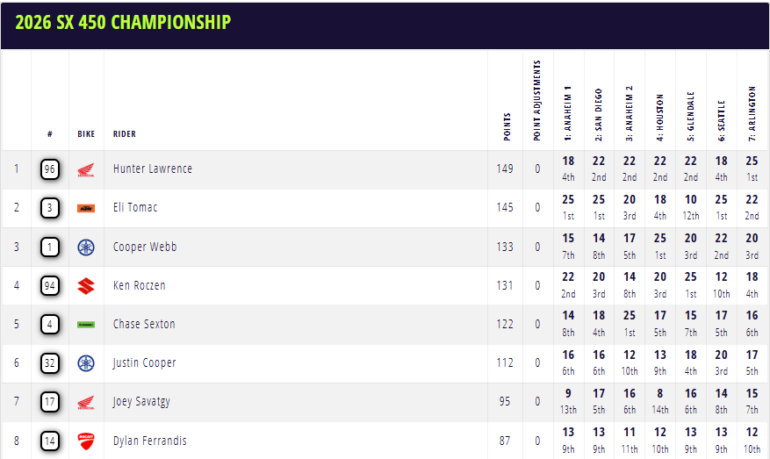 El séptimo capítulo del Mundial de SuperMotocross 2026 dejó una noche de estrenos en Arlington, donde el AT&T Stadium celebró la tradicional Military Appreciation Night. Allí, Hunter Lawrence (Honda) alcanzó por fin su primera victoria en la categoría reina y Pierce Brown (Yamaha) inauguró el año del Este con un triunfo muy esperado en 250SMX, en una velada marcada por regresos, sorpresas y cambios en la lucha por los títulos.