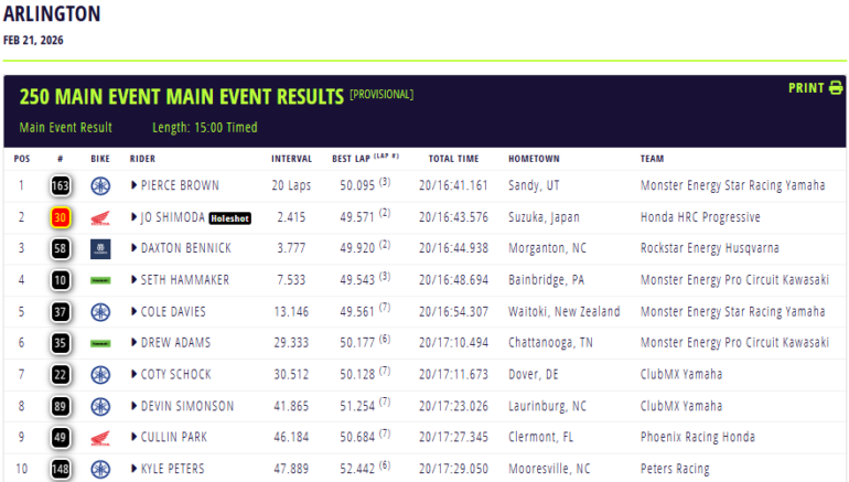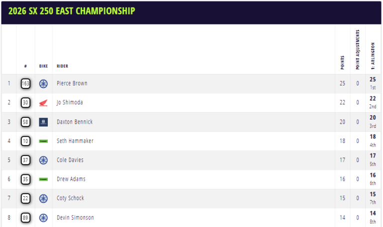 Desde allí, Brown resistió cada intento de Shimoda, incluido un último ataque en la vuelta final, para conquistar su primera victoria en Supercross tras 33 participaciones. Bennick completó el podio, con Seth Hammaker (Kawasaki) cuarto y Davies remontando hasta un meritorio quinto puesto. El triunfo coloca a Brown al frente del campeonato del Este por tres puntos sobre Shimoda y cinco sobre Bennick, y le otorga por primera vez en su carrera el honor de portar la placa roja.