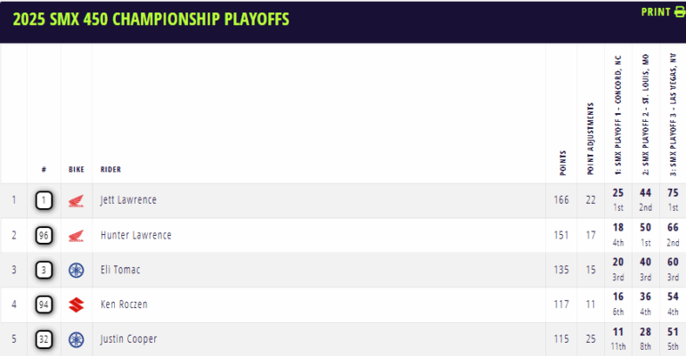 Jett Lawrence (Honda) se confirmó como el rey del motocross al asegurar su tercer Campeonato Mundial SMX consecutivo. Con una victoria en Las Vegas (1-2 en mangas), Lawrence no solo se llevó un bono de 100 mil dólares, sino también el premio de un millón al campeonato. Su hermano, Hunter Lawrence (Honda), completó el 1-2 familiar al terminar segundo en la carrera y en el campeonato, mientras que Eli Tomac (Yamaha) se ubicó tercero en ambas clasificaciones, cerrando un podio de élite.