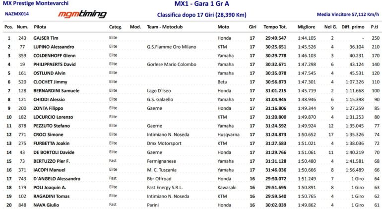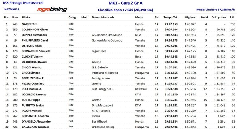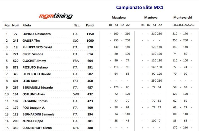 El líder es Lupino, pero el vencedor de las dos mangas fue el esloveno Tim Gajser, tres veces campeón mundial de MXGP y una de MX2. El gran nivel del campeonato sirve de preparativo para muchos que disputarán el Mundial de Motocross a partir de junio.