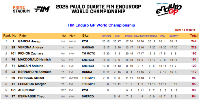 Campeón de Enduro2 en 2017 y 2021, campeón de Enduro1 en 2023, 2024 y 2025, pero lo más importante, es que repitió el campeonato del mundo de EnduroGP, que obtuvo por primera vez el año pasado. García vio como Verona se acercó en la fecha pasada y la amenaza de perder el trofeo global estaba alerta, aunque el de Enduro1 ya se había sellado.
