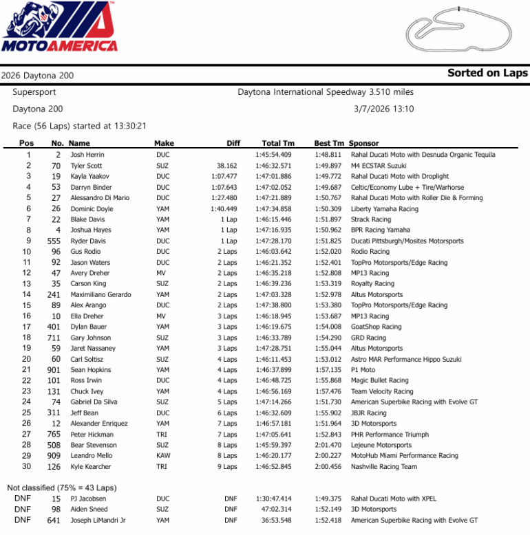 Josh Herrin ganó su 4° Daytona 200 consecutivo, la quinta de su carrera, lo que lo iguala con las leyendas Scott Russell y Miguel Duhamel como el piloto con más victorias en la carrera de Resistencia más importante de Estados Unidos. Tyler Scott terminó segundo (hizo la pole) y con18 años de edad Kayla Yaakov se convirtió en la primera mujer en hacer podio en el Daytona 200.-