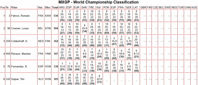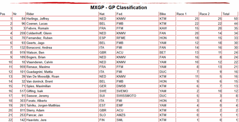 Herlings no dio oportunidades al resto, y es más, fue secundado por Lucas Coenen en ambas mangas, para que el 1-2 se transforme en absoluto y merecido para las máquinas anaranjadas. ‘The Bullet’ ganó dos competencias seguidas, está en plenitud otra vez, pero el campeonato ya se está desarrollando para otros lados debido a esa lesión que le impidió formar parte de gran parte de la primera mitad de temporada. Ahora Romain Febvre (Kawasaki) lidera con 26 unidades sobre Coenen, en otra carrera donde no hubo órdenes para ayudar al joven belga.