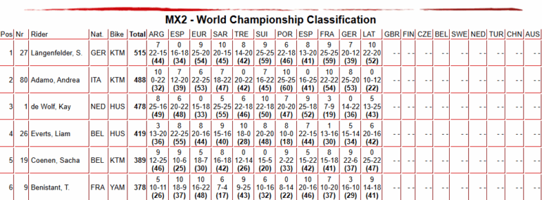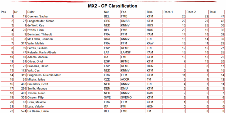 En MX2, el apellido Coenen sí que estuvo en lo más alto, porque Sacha ganó la primera manga de gran forma, y si bien la segunda fue para Kay de Wolf (Husqvarna), la general tuvo al belga al frente, seguido por Simon Längenfelder (KTM) y por el campeón De Wolf.
