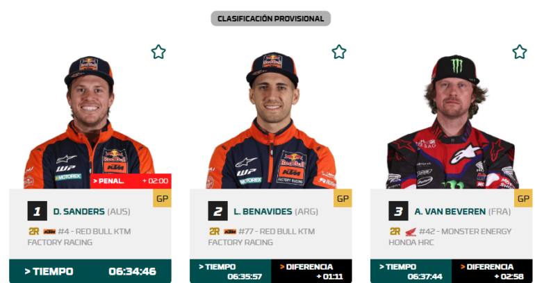 El Mundial de Rally Raid está en Sudáfrica, y luego de la victoria de Ross Branch (Hero) en la primera etapa, en la segunda tomó la posta Daniel Sanders (KTM) y lo secunda el argentino Luciano Benavides (KTM).