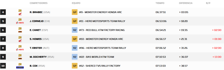 La categoría Autos, Seth Quintero (Toyota) lidera sobre el local Brian Baragwanath (Century) y Lucas Moraes (Toyota), mientras que las principales figuras de ayer, Henk Lategan (Toyota), Sébastien Loeb (Dacia) y Carlos Sainz (Ford), han perdido terreno.