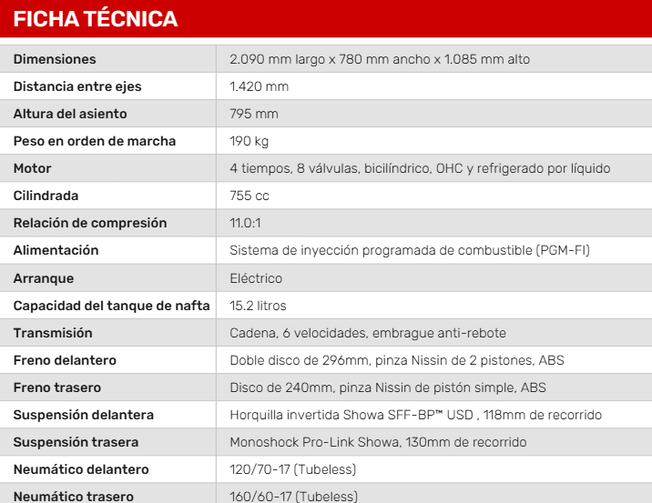 En un segmento deportivo que crece de forma constante, la CB750 Hornet destaca por su chasis ultraliviano y su equipamiento de última generación, manteniendo su ADN deportivo. Además, cumple con la homologación Euro5, lo que subraya su versatilidad y enfoque en la performance sin olvidar del respeto por el medio ambiente.