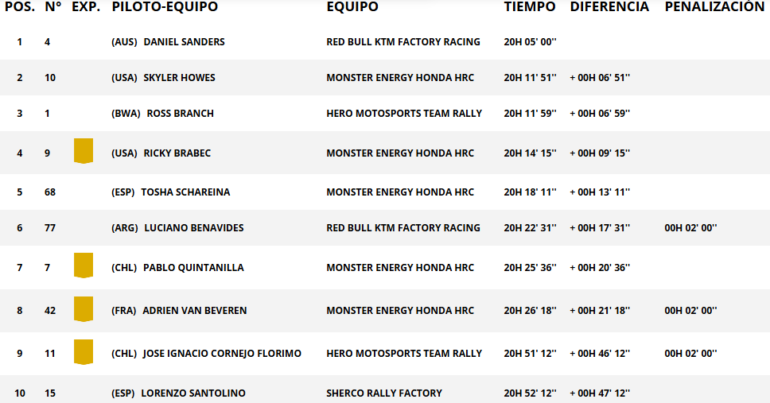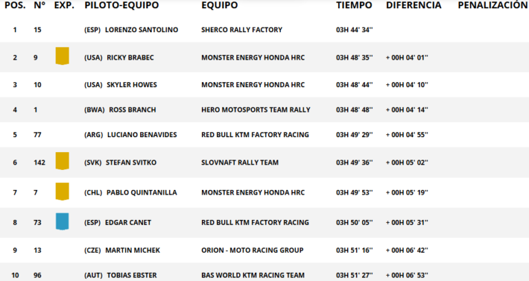 A pesar de algunas modificaciones del recorrido por lluvias, Arabia Saudita dio otro gran capítulo para este Dakar, a 500 metros de altitud y mesetas arenosas que pusieron a prueba a los competidores a lo largo de 200 kilómetros. Ricky Brabec (Honda) y Skyler Howes (Honda) completaron el tridente de adelante. El argentino Luciano Benavides (KTM) fue quinto, y hoy fueron más de 15 pilotos los que descontaron tiempo al líder de la general Daniel Sanders (KTM). El australiano quedó 17º a casi diez minutos, y ahora es acechado por Howes y Ross Branch (Hero), a menos de siete minutos. Ricky Brabec (Honda) es cuarto, Tosha Schareina (Honda) quinto y el menor de los Benavides recortó a 17m31s la diferencia.