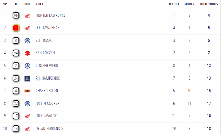 La primera manga de la Clase 450 tuvo a Hunter dominando con buen ritmo, mientras que Jett se vino desde el puesto 21 hasta terminar luchando por ser segundo en los últimos metros, aunque se debió conformar con ser cuarto, detrás de Ken Roczen (Suzuki) y Eli Tomac (Yamaha). Con Tomac también hubo una gran batalla hasta el final, pero por la victoria, donde la Honda #18 del australiano se impuso. No obstante, Hunter con la #96 resultó ganador de la general, y fue 1-2 para los hermanos oceánicos. Tomac completó el podio, y es el tercero en discordia por el cetro.