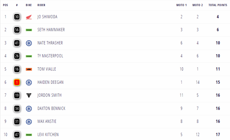 En Clase 250, las victorias en las mangas fueron para Haiden Deegan (Yamaha) y Tom Vialle (KTM), dos de los más veloces de todo el año. Pero Deegan tuvo un mal resultado en la segunda carrera y eso permitió que el japonés Jo Shimoda (Honda), ganara el evento con sendos segundos puestos. Vialle tuvo una mala carrera en la primera manga y una estupenda en la segunda, que ni siquiera le valió podio. Shimoda fue escoltado por Seth Hammaker (Kawasaki) y Nate Trasher (Yamaha), y quien llegará como puntero a la definición es Shimoda, diez puntos por delante de Deegan.