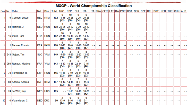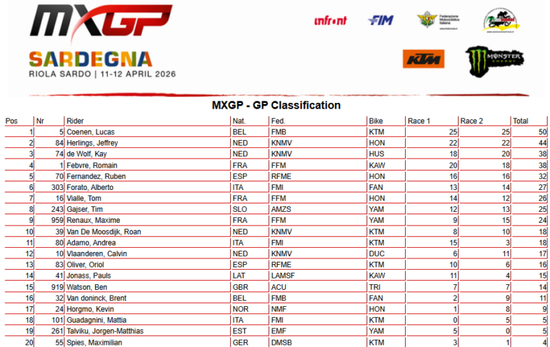 El fin de semana dejó una clasificación general dominada por Coenen, seguido por Herlings y Kay de Wolf (Husqvarna), quienes completaron el podio del GP. En el campeonato, Coenen se mantiene líder con una ventaja creciente, seguido por Herlings en segundo lugar y Tom Vialle (Honda) en tercero, consolidando un inicio de temporada donde la regularidad está marcando diferencias.