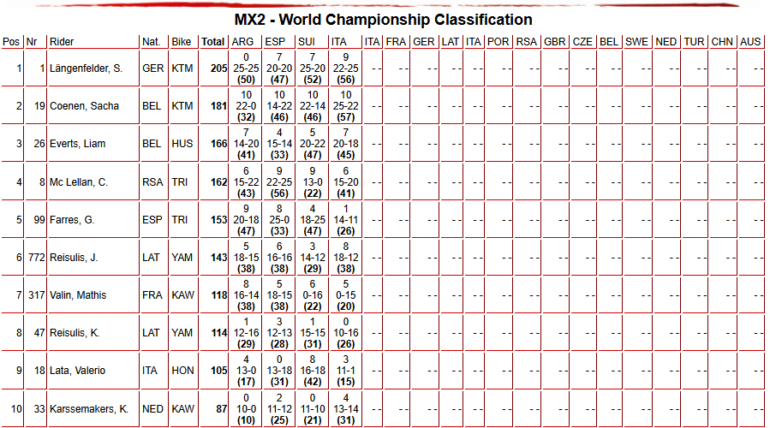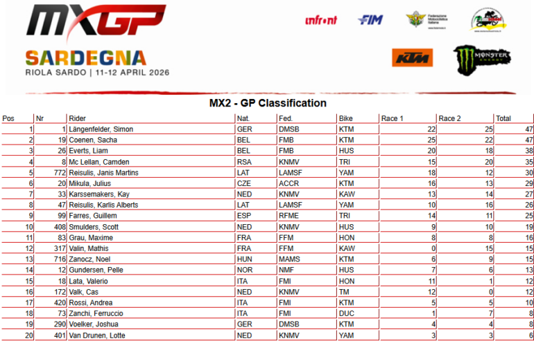 El podio del GP quedó en manos de Laengenfelder, seguido por Sacha Coenen y Liam Everts (Husqvarna). En la clasificación del campeonato, Laengenfelder se mantiene al frente, con Coenen en la segunda posición y Everts tercero, en un arranque de temporada donde la categoría promete una lucha cerrada entre los tres y los pilotos de Triumph, Camden McLellan y Guillem Farrès.