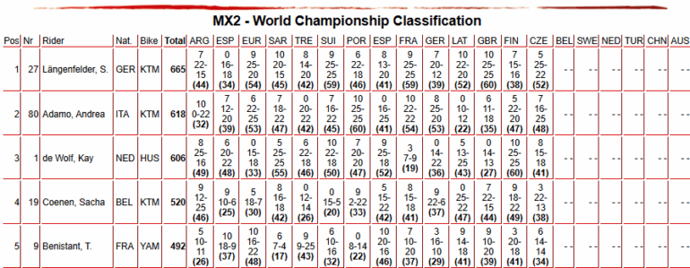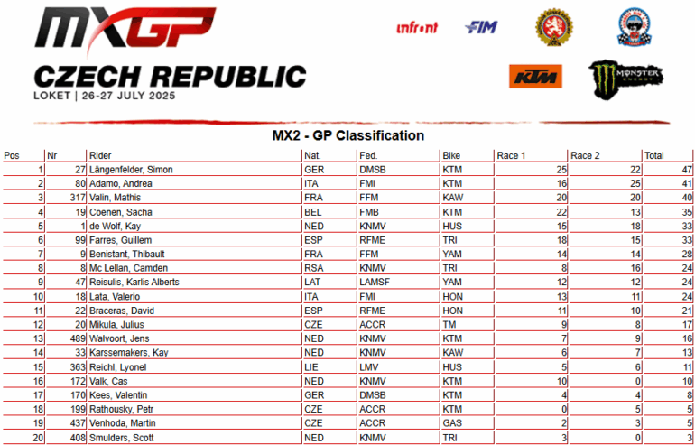 Pasando a la categoría MX2, Simon Längenfelder (KTM) fue el indiscutible vencedor en Loket. Fue 1-3 para dominar el GP, y además para fortalecer significativamente su posición en la cima de la clasificación del campeonato. Su rendimiento fue una combinación de velocidad y control, lo que le permitió distanciarse de sus rivales directos en la lucha por el título.