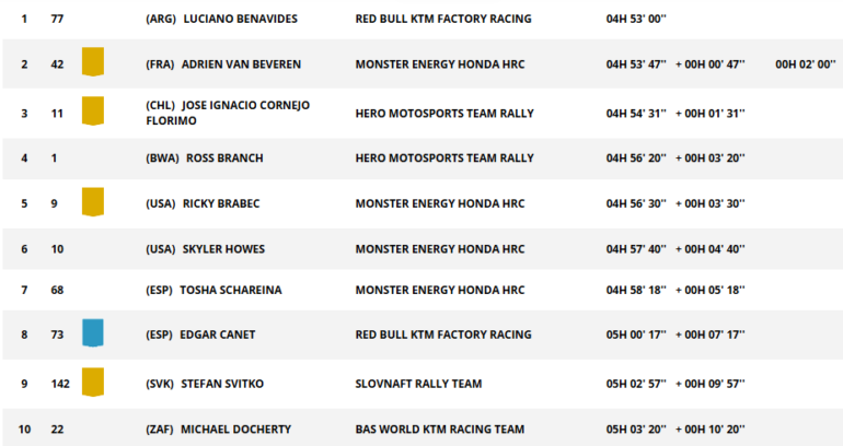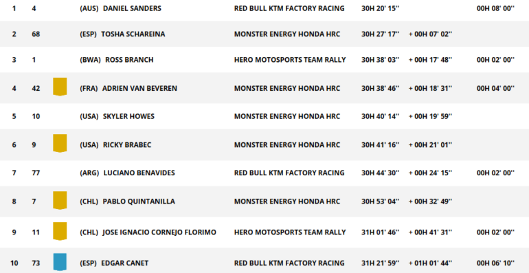 El favorito es Sanders, pero nada está dicho, y más con la batalla de marcas a flor de piel, que tiene a KTM líder, a Honda escolta y a Hero tercera con el campeón mundial Ross Branch. Van Beveren subió al cuarto peldaño de la general, siendo la segunda mejor Honda, delante de Skyler Howes (Honda) y Ricky Brabec (Honda). Luego, Luciano Benavides, Pablo Quintanilla (Honda) y José Ignacio Cornejo (Hero) ponen a Sudamérica bien representada en el Top 10. El que lo cierra es el joven español Edgar Canet (KTM), líder de Rally2.