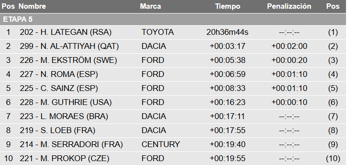 Dentro de los autos, en la Ultimate volvió a la senda victoriosa Mitch Guthrie (Ford), con las Raptor dominando el camino de manera alternada, como viene sucediendo a lo largo de esta primera semana. En la general, el sudafricano Henk Lategan (Toyota) sigue comandando la clasificación, 3m17 delante de Nasser Al-Attiyah (Dacia), pero atención, que los Ford oficiales están del tercero al sexto lugar al acecho, con Mattias Ekström, Nani Roma, Carlos Sainz y Guthrie.