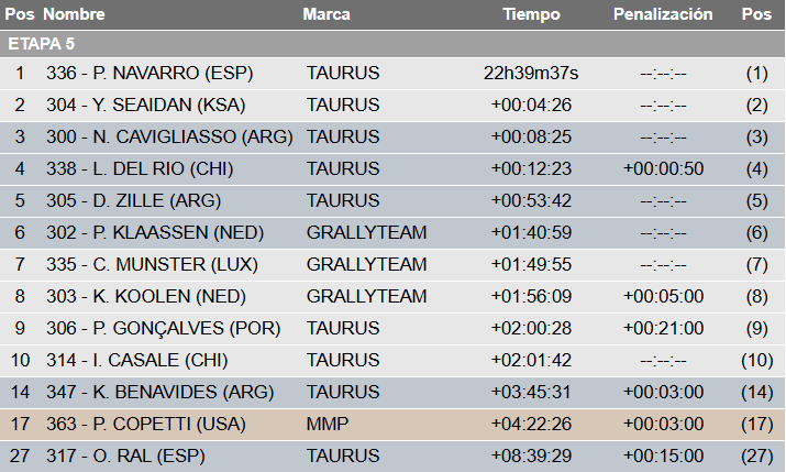 La general la domina Pau Navarro (Taurus) de España, superando a Yasir Seaidan (Taurus), el escolta. Cavigliasso sigue tercero y están a menos de ocho minutos y medio de la punta, siendo favoritos para revalidar la corona junto a su esposa Valen Pertegarini. Jacomy es cuarto, Zille y Cesana quintos y Sanz sexto, todos los argentinos que se sostienen en el Top 10. Benavides ya está 14º, mientras que Pablo Copetti (MMP) sigue 17º. Completa el navegante Fernando Acosta en el casillero 27º, compitiendo junto a Oscar Ral.