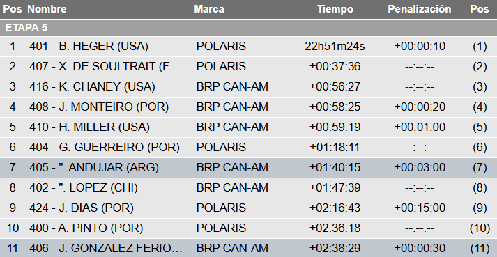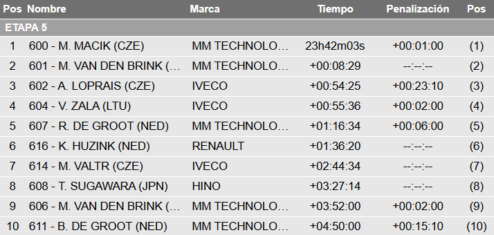 Completando, en Camiones fue nuevamente triunfo de Martin Macik (Iveco), liderando la general por menos de ocho minutos y medio sobre Mitchel Van den Brink (Iveco). Ales Loprais (Iveco), quien sigue tercero, ya está casi a una hora.