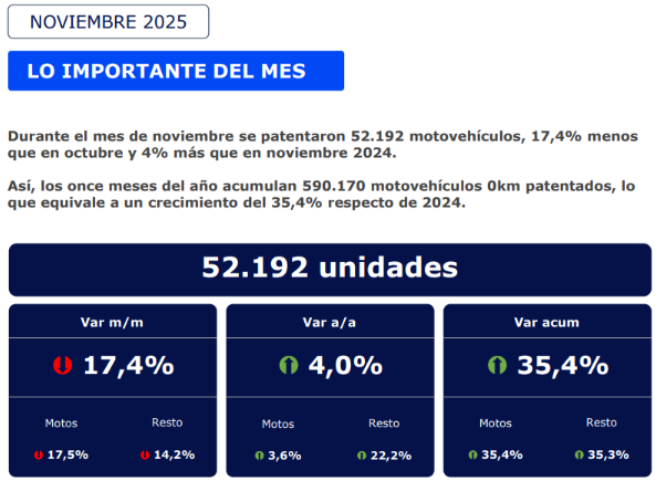 Este registro representa un crecimiento interanual del 4% en comparación con las 50.173 motos patentadas en noviembre de 2024, consolidando la recuperación del sector.