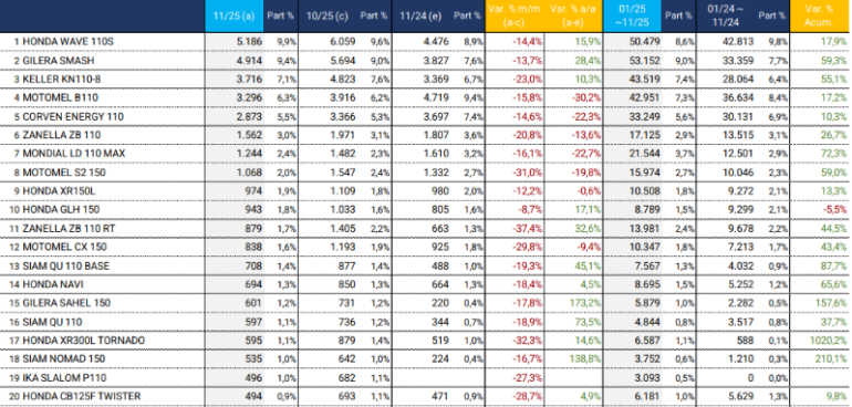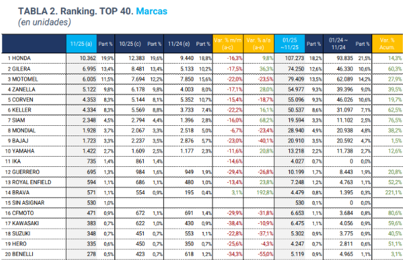 En cuanto a la participación de mercado, Honda sostuvo su indiscutible liderazgo en noviembre con 10.362 unidades. El ranking de las cinco marcas más vendidas quedó conformado de la siguiente manera: