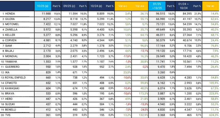 En marcas, no se observan cambios con respecto a septiembre en los primeros puestos: Honda siguió liderando el mercado con 11.988 unidades, seguida por Gilera con 8.217, que llegó a estar cuarta en marzo, y por Motomel, que con 7.422, sigue en la tercera posición. En el cuarto puesto, al revés de lo que pasó en agosto, está ahora Zanella con 5.972 y Keller con 5.377 cierra el top five.
