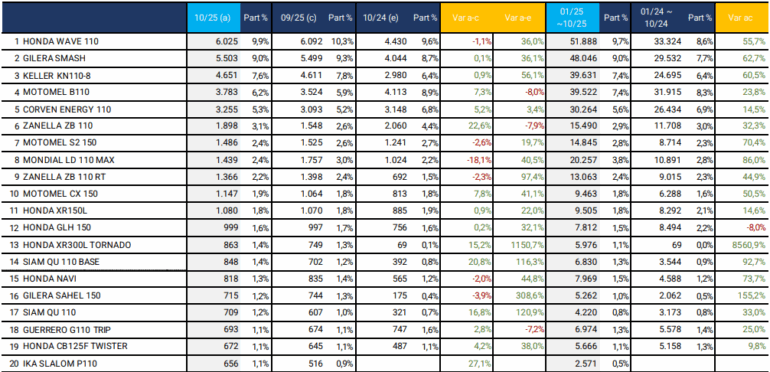 Tampoco se observan modificaciones en cuanto al modelo más patentado, la histórica líder de años anteriores, la Honda Wave 110, con 6.025 unidades, se mantiene en la cima por tercer mes consecutivo, seguida por la Gilera Smash, con 5.503, que lideró gran parte del año. Se mantiene en el tercer escalón, la Keller KN 110-8, con 4.651, lo que hizo que la Motomel B110, con 3.783 continúe en el cuarto puesto. La novedad de septiembre, que se mantuvo en octubre, había sido el retorno al top five de la Corven Energy 110 by Corven, que con 3.255 unidades trepó al quinto puesto y allí continua.