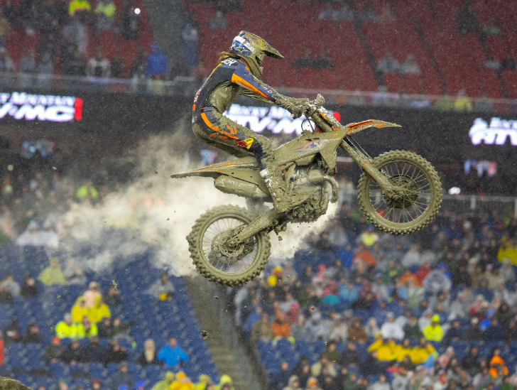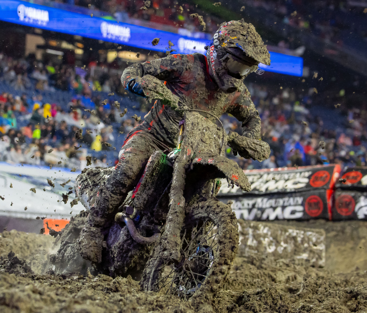 El AMA Supercross de Foxborough, fue un verdadero dolor de cabeza para pilotos, equipos y organizadores, con un clima poco favorable. Eso no impidió a Aaron Plessinger (KTM) salir feliz del Gillette Stadium, totalmente tapado de barro, aunque sin poder esconder la alegría por haber vuelto a la gloria en la Clase 450 SX.