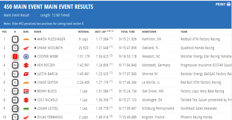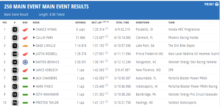 Cullink Park (Honda) también fue protagonista, terminando segundo, en lo que terminó consumándose como primer podio en AMA Supercross. Gage Linville (KTM) completó las celebraciones, ganando más de diez posiciones en las apenas seis vueltas disputadas.
