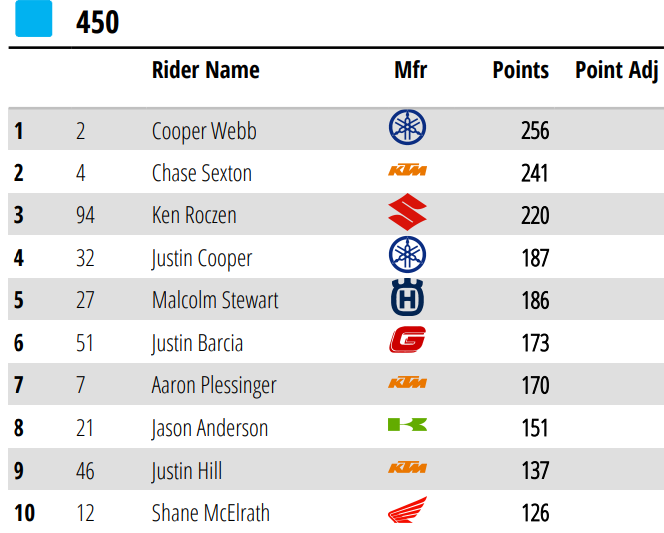 Shane McElrath (Honda), también supo navegar en el barro para llevarse el segundo escalón del podio, en un evento donde ganó su primera manga en 450, y terminó coronando con podio, detrás de Plessinger y delante de Cooper Webb (Yamaha), el líder del certamen que minimizó pérdidas. Ken Roczen (Suzuki) finalizó cuarto, luchando contra una lesión en el tobillo que empeoró durante el evento, tornándose en una de las grandes figuras por haber terminado y sumado fuerte otra vez.