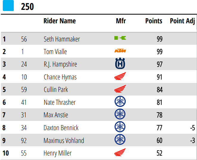 En Clase 250 Este, Chance Hymas (Honda) prevaleció en una acortada competencia final, pero eso no impidió sumar estadísticas notables para la divisional menor, con seis vencedores diferentes en estas seis fechas de la divisional oriental.
