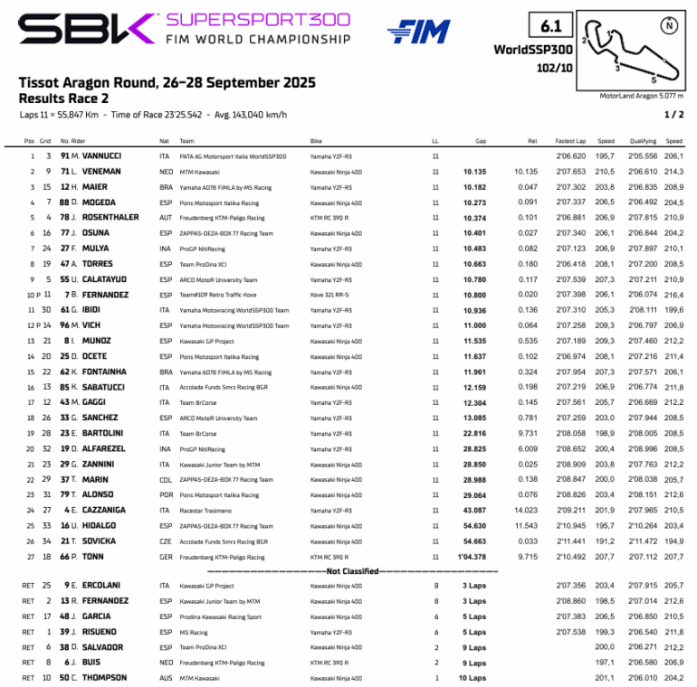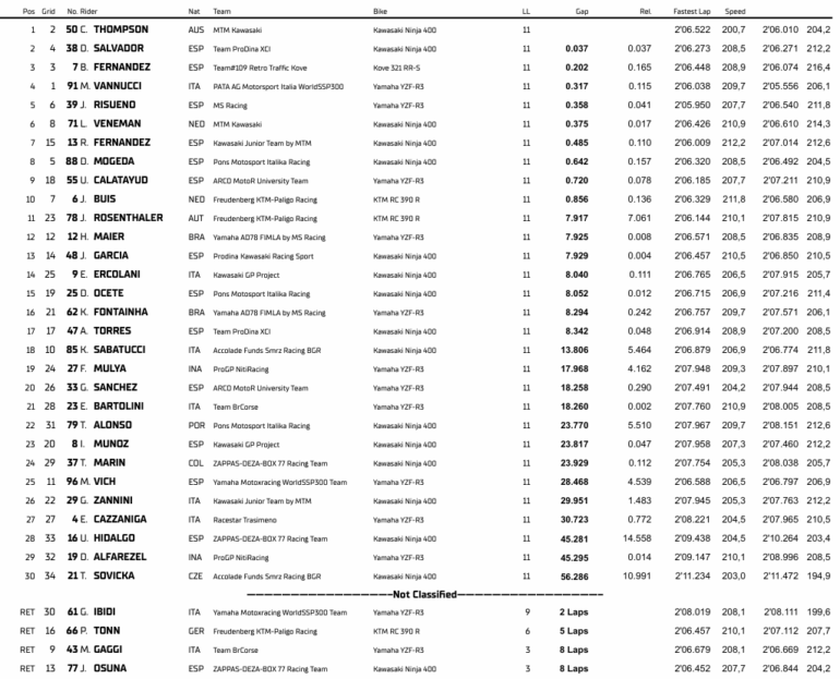 Matteo Vannucci (PATA AG Motorsport Italia) logró cuarta victoria en la Carrera 2. Loris Veneman (MTM Kawasaki) fue segundo y segundo podio y el mencionado Humberto Maier (Yamaha AD78 FIMLA by MS Racing) completó el Top 3, sumando su séptimo podio desde que corre en el Mundial.
