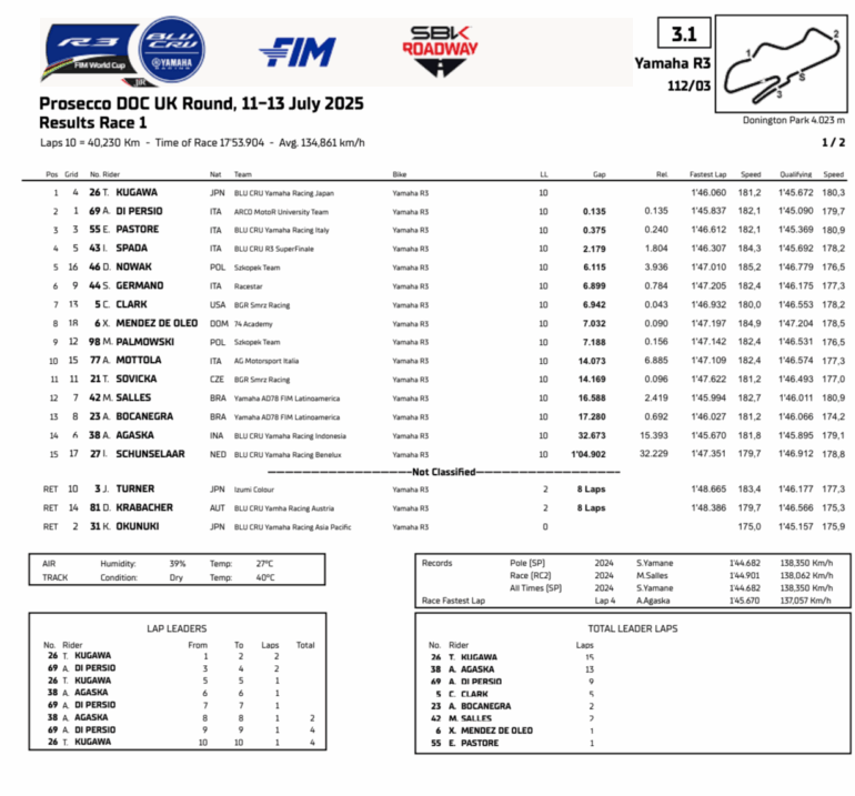 La 3ª Fecha del Campeonato del Mundo de R3 (FIM World Cup R3) que se corrió en Donington Park, Inglaterra; como categoría telonera del WorldSBK; tuvo dos ganadores diferentes y un piloto sudamericano en el podio.