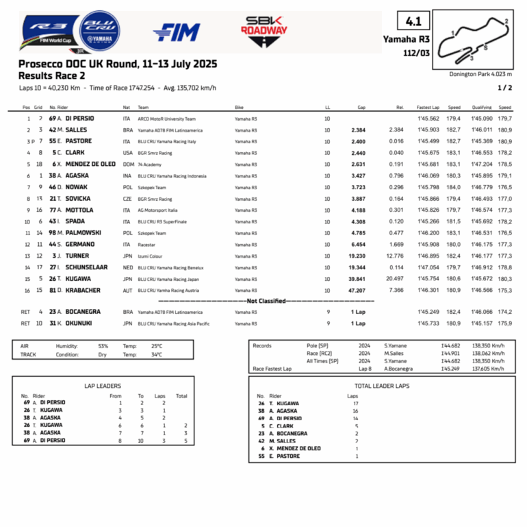 Mario Salles de Brasil del Yamaha AD78 FIM Latinoamerica logró el 2° puesto en la Carrera 2 y fue su segundo podio de la Temporada 2025, incluyendo una victoria. Ahora Salles es tercero en el ranking a 36 puntos del líder.