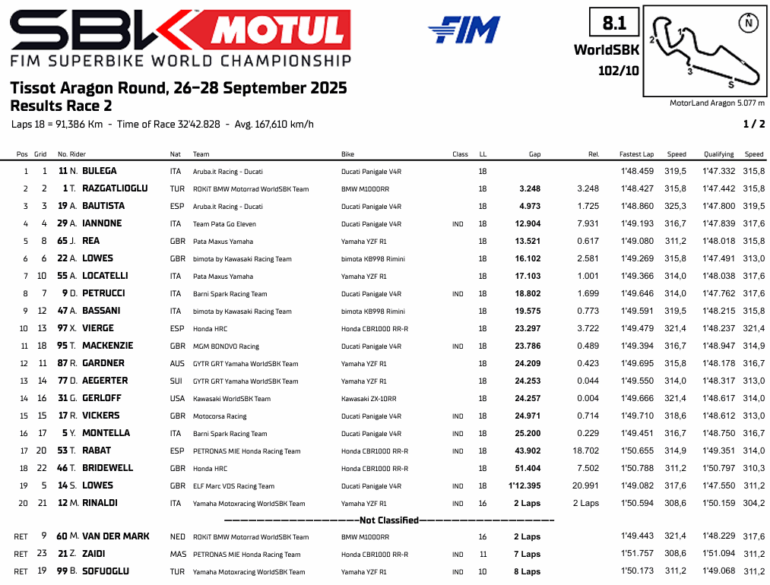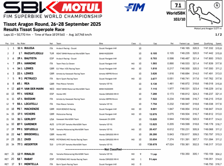 El domingo de Aragón fue diferente en cuanto a posiciones y no de duelo: Bulega esta vez se impuso a Razgatlioglu. Primero en otro codo a codo en la Sprint y en la Carrera 2 sacando más de tres segundos sobre el de BMW. En ambas finales Alvaro Bautista fue tercero.