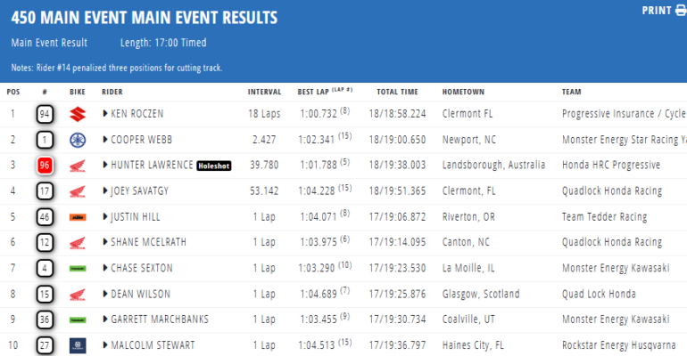 Con Lawrence retrasado, Roczen administró la ventaja pese al intenso tráfico de rezagados que complicó el tramo final. Webb lanzó un ataque en la última vuelta y llegó a ponerse a pocos metros, pero Roczen respondió con firmeza para sellar su quinta victoria del año, cuarta en las últimas cinco fechas, y así asumir el control del campeonato con dos carreras por disputarse. Lawrence completó el podio en tercer lugar.