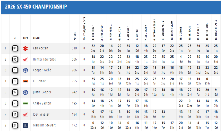 El AMA Supercross terminó de dar un vuelco deportivo en Philadelphia, durante una noche dramática bajo la lluvia. El barro se convirtió en el gran protagonista y redefinió el rumbo de ambas categorías. En la Clase 450, Ken Roczen (Suzuki) firmó una actuación clave para adueñarse del liderato del campeonato, mientras que en la Clase 250 Este, el joven neozelandés Cole Davies (Yamaha) coronó una temporada brillante asegurando su primer título profesional.