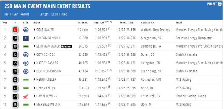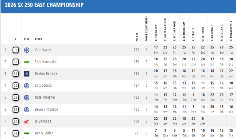 En los minutos finales, Davies se mantuvo impecable y cruzó la meta con más de 12 segundos de ventaja sobre Bennick, asegurando su quinta victoria del año y, con ella, el título del Este 2026. Hammaker necesitaba terminar segundo para mantener viva la lucha por el campeonato, pero una caída en la última vuelta lo dejó tercero y selló matemáticamente la consagración del neozelandés, quien se convierte en el segundo piloto de su país en lograr un título de Supercross.