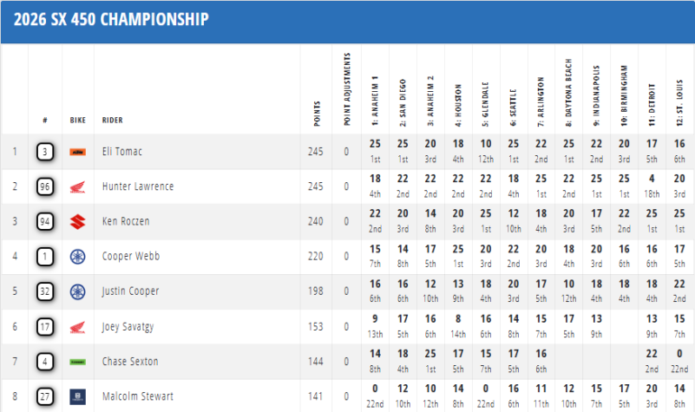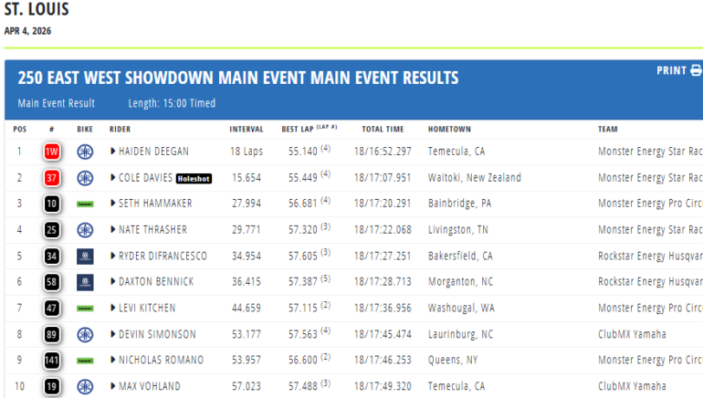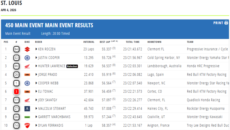 La duodécima fecha del AMA Supercross 2026 en Saint Louis dejó dos titulares contundentes: Ken Roczen (Suzuki) firmó su segunda victoria consecutiva en la Clase 450, metiéndose de lleno en la lucha por el título, mientras que Haiden Deegan (Yamaha) selló de manera dominante su segundo campeonato consecutivo del Oeste en 250, coronándose durante el Showdown Este/Oeste. Una noche cargada de emoción en The Dome at America’s Center, en el marco del tradicional Love Moto Stop Cancer Supercross, que homenajea a los niños del St. Jude Children’s Research Hospital.