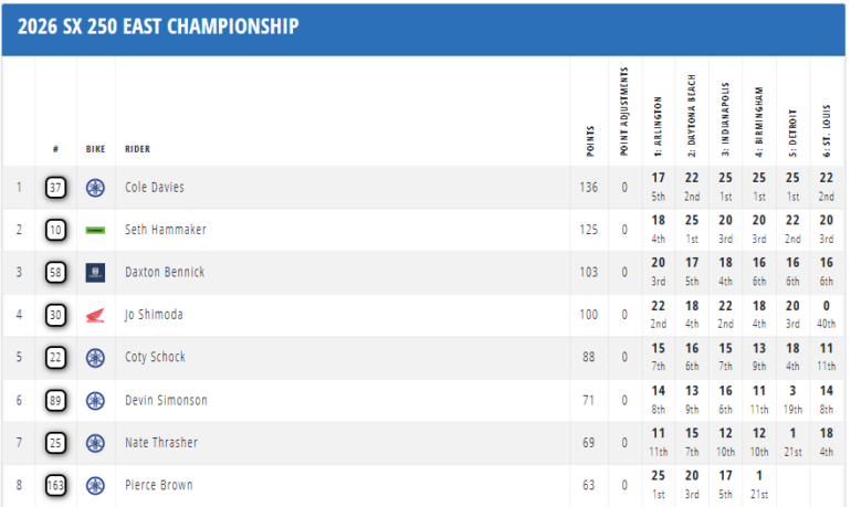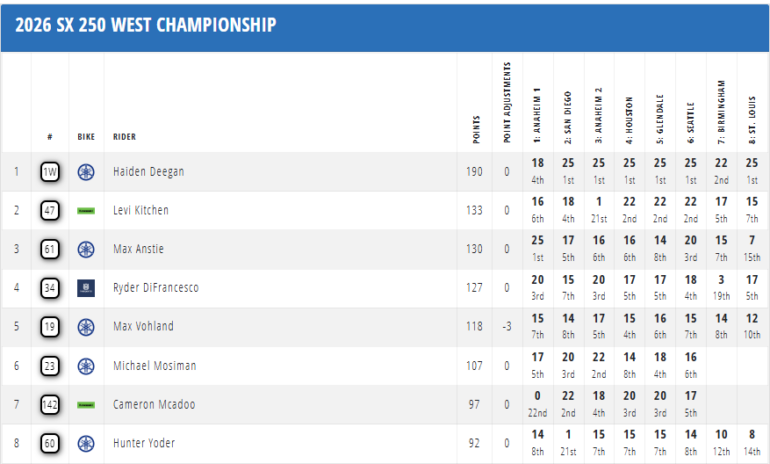 El 15.º puesto de Anstie selló matemáticamente el campeonato para Deegan, quien suma así su sexto título en la categoría 250, consolidando una de las carreras más exitosas en la historia reciente de la división antes de su salto definitivo a la 450. Davies, por su parte, amplió su ventaja en la lucha por el título del Este, ahora con 11 puntos sobre Hammaker cuando restan cuatro fechas.