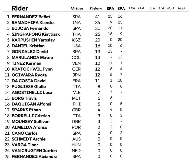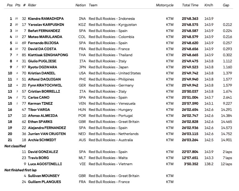 En la carrera 2 otro asiático se puso en la órbita del triunfo: el indonesio Kiandra Ramadhipa se quedó con el primer puesto en un final de siete motos separadas por 300 milésimas. Yaroslav Karpushin (otro piloto de Rider Formation) de Kirguistán del Asia Central, se subió al segundo puesto y fue tercero en pista Mateo Marulanda pero fue recargado con un puesto por superar los límites de pista. Quedó tercero Beñat Fernández y con el podio, el español es el líder del campeonato. Fernando Bujosa fue 5° en la Carrera 2 y Kerman Tinez rescató un punto con el 15° puesto.