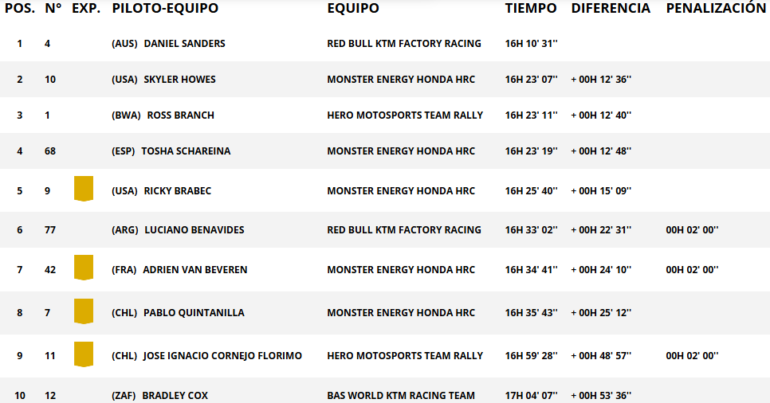 Sanders ahora tomó más de 12 minutos y medio sobre sus principales perseguidores: Skyler Howes (Honda), Ross Branch (Hero), Tosha Schareina (Honda) y Ricky Brabec (Honda). El argentino Luciano Benavides (KTM) se encuentra sexto a 22 minutos a pesar de una fuerte caída, mientras que el Top 10 lo completan Adrien Van Beveren (Honda), Pablo Quintanilla (Honda), José Cornejo (Hero) y Bradley Cox (KTM).