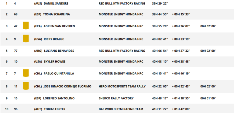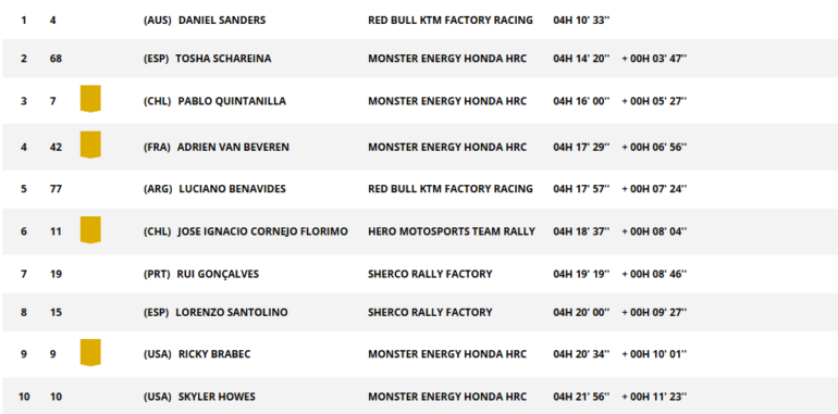Benavides fue quinto cediendo casi siete minutos y medio contra Sanders, pero del Top 5, solo le descontó a Brabec. Por el momento, sigue con buenas chances de ir al podio, porque está a menos de doce minutos del francés Van Beveren. Por la victoria, está a más de 37 minutos. Por ahora, Sanders y Schareina son los grandes favoritos, separados por 15 minutos, algo que según los acontecimientos parecerá mucho o poco, en un Dakar que siempre puede tener una sorpresa.