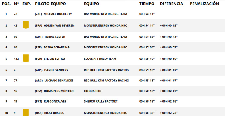 Pero para Sudamérica, el principal logro fue para Nicolás Cavigliasso (ganador 2019 en Cuatriciclos), quien junto a su esposa Valentina Pertegarini se quedaron con la victoria en la clasificación Challenger. Brock Heger lo hizo en SSV, delante del chileno Francisco ‘Chaleco’ López. En Autos, la general fue para el local Yazeed Al-Rajhi (Toyota), en un día inolvidable para los locales y su historia deportiva. En Camiones, Martin Macik venció de forma holgada.