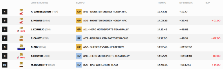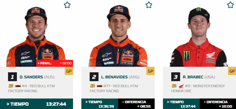 Con estos resultados, en Motos es abrumadora la diferencia de Daniel Sanders en la cima del clasificador anual, faltando dos pruebas, en Portugal y Marruecos. Benavides es segundo a 35 puntos de su compañero, al igual que el tercero, Brabec.