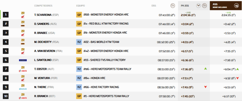 Honda amenazó seriamente las chances de que KTM logre la corona, desde el primer día con el abandono de Luciano Benavides (KTM). Mientras el salteño se recupera de las lesiones, Honda atacó y trató de poner en aprietos a Sanders, quien arrancó como líder, pero no se desesperó y llegó en el podio para que la marca austriaca derrote a la japonesa, que lo rodeó con Schareina, el ganador, pero también con Ricky Brabec y Adrien Van Beveren. El Top 5 de la general lo cerró Edgar Canet (KTM), campeón mundial en Rally 2 como debutante y siendo joven, es el futuro de KTM en el Rally Cross Country.