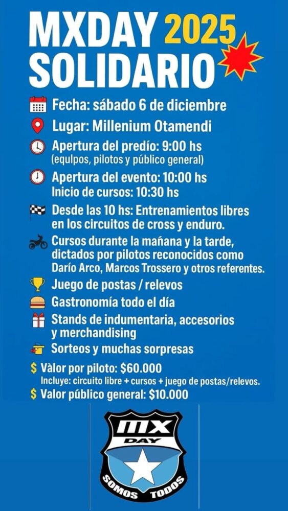 El sábado 6 de diciembre se desarrollará el MX Day Solidario 2025, con múltiples actividades para apasionados de las dos ruedas. Ya están a la venta las acreditaciones para pilotos y entradas para público en general, para el evento a realizarse en el predio Millenium Otamendi de Campana.