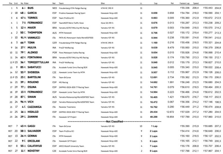 Buis se impuso en la Carrera 1 del Campeonato del Mundo FIM Supersport 300 haciendo valer su experiencia en la divisional mientras que el debutante Beñat Fernández, que sorprendió a todos con la pole del viernes sobre la Kove China, se impuso de manera brillante sobre el cierre de la Carrera 2 también haciendo valer su experiencia del FIM JuniorGP donde corrió en el ETC.
